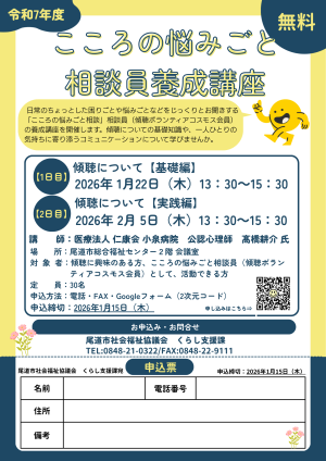 対 象 者:傾聴に興味のある方、こころの悩みごと相談員(傾聴ボランティアコ